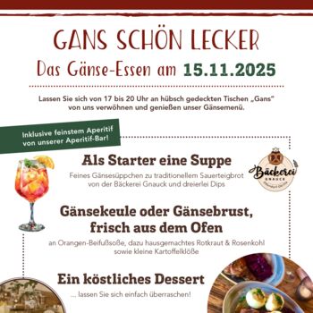 Lassen Sie sich von 17 bis 20 Uhr an hübsch gedeckten Tischen „Gans" von uns verwöhnen und genießen unser Gänsemenü.